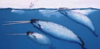 | Dibujo de tres narvales machos: El del medio sería uno de dos colmillos |